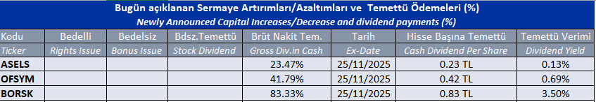 Sermaye Artırımları/Azaltımları ve Temettü Ödemeleri 25/11/2025