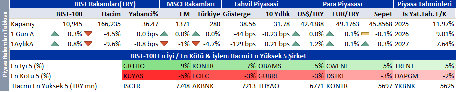 Dünya piyasalarının seyri Borsa İstanbul’da yatay pozitif bir açılışa işaret ediyor. Bankalar ve barış hisselerinde yükseliş devam ederse endeks psikolojik olarak önemli 11bin direncini deneyebilir. Yıldız Holding toplantısı ve yazılan raporlar nedeniyle Şok Marketler pozitif tepki verebilir. Teknik olarak beğendiğimiz hisseler: Anadolu Grubu Holding, Oyak Çimento, Tüpraş. Endeks için destek ve direnç seviyeleri 10.800 ve 11.000.