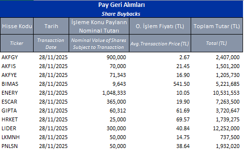 Pay geri alım programları kapsamında ilgili tarihte geri alım yapan şirketlerin listesini aşağıdaki tabloda bulabilirsiniz. Uyarı Notu: Sabah 9:00'a kadar...