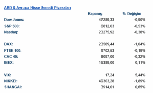 Haftanın ilk işlem gününde küresel risk iştahı zayıflarken, kripto varlıklardaki sert satışların etkisiyle ABD endekslerinde satıcılı bir seyir izlendi. S&P 500 endeksi seans içinde 6.800 seviyesinin altını test etse de günü bu seviyenin hafif üzerinde %0,5 düşüşle tamamladı. Nasdaq 100 %0,4 ve Dow Jones %0,9 gerilerken, küçük ölçekli şirketleri temsil eden Russell 2000 endeksi %1,2 oranında değer kaybetti. MSCI World endeksi de küresel riskten kaçışla birlikte %0,5 ekside kapattı.