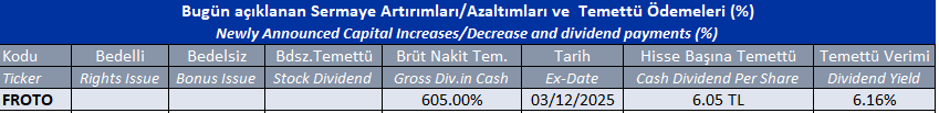 Sermaye Artırımları/Azaltımları ve Temettü Ödemeleri 03/12/2025