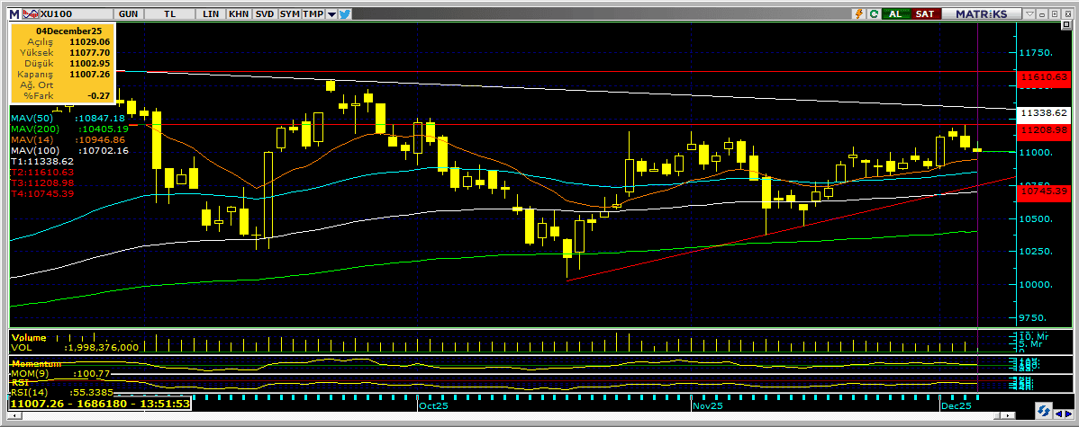 Endeks için 11.100 kısa vadeli direnç olmakla birlikte 200 günlük USD hareketli ortalamanın da bulunduğu seviye olarak orta vadeli trend açısından önem taşıyor. Bu seviyenin aşılması durumunda 11.200 ve 11.330 seviyeleri diğer dirençler, 11.000 altında da 10.900 ve 10.800 destekler olarak öne çıkıyor.