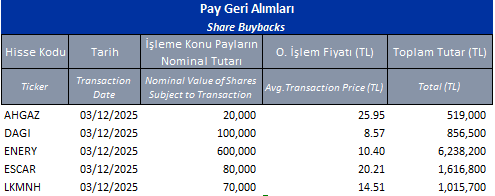 Pay geri alım programları kapsamında ilgili tarihte geri alım yapan şirketlerin listesini aşağıdaki tabloda bulabilirsiniz.