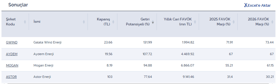 En az %75 getiri potansiyeli olan ve 2025&26’da %25 üzeri FAVÖK Marjı beklenen şirketler listesini aşağıda inceleyebilirsiniz.