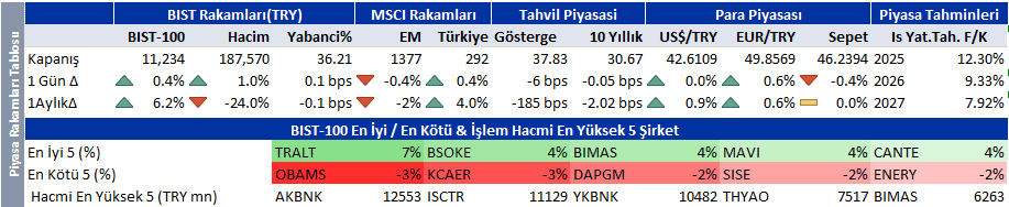 Dünya borsalarının seyri Borsa İstanbul’da yatay bir açılışa işaret ediyor. Asgari ücret görüşmeleri, kamu hizmetlerine yeni yılda yapılacak zamlar piyasa yönünü ve hisse rotasyonunu belirleyecek. %30 civarı asgari ücret artışı ve %25 ve üzerinde gelecek kamu zamları Merkez Bankası’nın adım küçültmesine ve bankalarda satışa yol açabilir. Buna karşın gıda perakendesi ve genelde perakende hisseleri pozitif tepki verir. Endeks için destek ve direnç seviyeleri 11.200 ve 11.320.