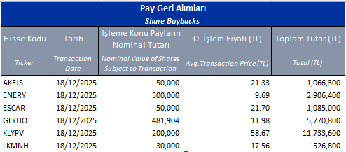 Pay geri alım programları kapsamında ilgili tarihte geri alım yapan şirketlerin listesini aşağıdaki tabloda bulabilirsiniz.