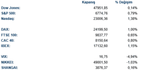 Endekslerde Dow Jones %0.23, S&P 500 %0.88 ve Nasdaq %1.50 değer kazanarak günü tamamladı. Sektörlerde S&P 500 endeksinde %1.96, iletişim %1.55 ve IT %1.50 değer kazanarak günü tamamladı. Enerji %1.41 ve temel tüketim %0.67 değer kaybederek günü tamamladı. Dow Jones endeksinde IT %0.64, taktirsel tüketim %0.60 ve iletişim %0.58 değer kazanarak tamamladı. Enerji %1.23 değer kaybederek günü negatif ayrışarak kapattı.
