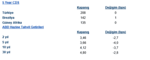 Enflasyon verisi sonrasında ABD getirilerinde tüm vadelerde sert düşüşler gözlemlendi. Özellikle uzun tarafta getiriler kısalara karşı daha sert geri çekilirken faiz indirim beklentileri arttı. 10 yıllık ABD hazine tahvili 3.5 baz puan düşerek 4.11 oldu. 2 yıllık 2.5 baz puana düşerek 3.45 seviyesine gelirken 5 yılık ise 3.8 baz puan düşerek 3.66 seviyesinde günü tamamladı.