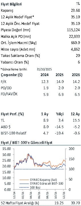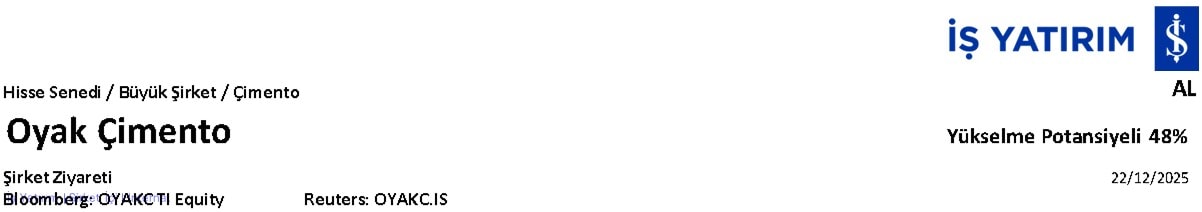 Adana Çimento fabrikasına gerçekleştirdiğimiz ziyaret ve yönetimle yapılan görüşmeler, OYAK Çimento’nun zorlu sektör koşullarına rağmen operasyonel ve finansal açıdan rakiplerine kıyasla daha dayanıklı bir performans sergilediğini göstermektedir. Şirket, çimento sektör cirosunun %27’sini üretmesine karşın sektör FAVÖK’ünün %37’sini üretmeyi başarmaktadır. Mevcut durumda OYAKC hissesi son 12 ayda 7,2x FD/FAVÖK çarpanıyla işlem görmekte olup, yaklaşık 7,6x FD/FAVÖK seviyesindeki piyasa medyanına kıyasla iskontolu bir değerlemeye işaret etmektedir.