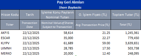 Pay geri alım programları kapsamında ilgili tarihte geri alım yapan şirketlerin listesini aşağıdaki tabloda bulabilirsiniz.