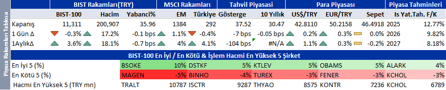 | Borsa İstanbul küresel yükselişe katılamıyor Hisse senedi ve değerli metallerde eşanlı yükseliş devam ediyor. Teknoloji devleri ile başlayan alım dalgası genele yayılmaya başladı. Altın madeni, banka, demir-çelik, enerji, hava yolu hisseleri endekse göre daha güçlü. Çin’e ihracatın şubat ayında başlayacağı beklentisi ile Nvidia, yeni zayıflama ilacının onaylanması ile Novo Nordisk yükselişte öncü rol oynuyor. Perakende yatırımcı hareketlerine bakıldığında hisse-tahvil karışımlı fonlardan çıkış görülüyor. Yatırımcılar hisse senedi pozisyonlarını tahvil fonları yerine doğrudan altın ve gümüş gibi değerli metalleri alarak korumaya başladılar. Genişleyici maliye politikası endişesi ile tahvil getirileri ve politika faizi arasındaki ilişkinin 1998 sonrası ilk kez bozulması yatırımcıların değerli metallere yönelmesine neden oldu. Borsa İstanbul küresel risk iştahındaki toparlanmaya katılamadı. Düşük Aralık enflasyonu beklentisi ile gıda perakendesi hisseleri satılırken, bankalar pozitif ayrışmaya devam etti. Beyaz eşya, demir-çelik, havacılık, holding, petrokimya sert değer kaybeden sektörler. Türk Telekom ve Tofaş Fabrika sektörlerine göre pozitif ayrışırken, TSKB ve Turkcell negatif ayrıştı. Dünya piyasalarının seyri Borsa İstanbul’da sınırlı pozitif bir açılışa işaret ediyor. Aralık ayında %1,0’in altında enflasyon beklentisini arkasına alan bankalar yükselişte başı çekmeye devam edebilir. Tahvil faizlerinde ve ülke risk priminde gerileme de banka hisselerini destekliyor. Endeks için destek ve direnç seviyeleri 11.200 ve 11.400. En Çok Önerilen listesinden Koç Holding’i çıkarıp, yerine Medikal Park’ı koyuyoruz. Teknik bültende alış yönünde Akbank, Yapı Kredi Bankası, Medikal Park’ı, satış yönünde Koç Holding’i öne çıkartıyoruz. |