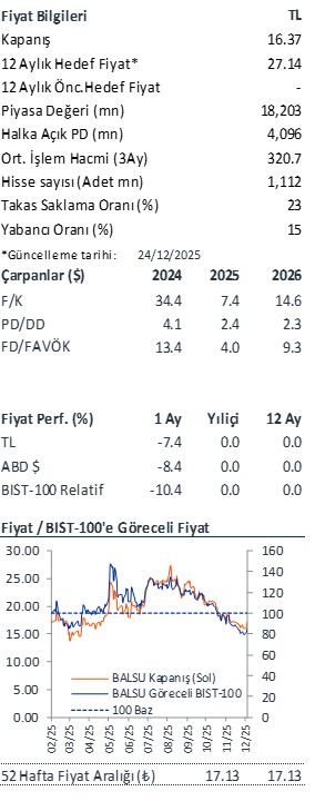 Balsu Gıda’yı AL tavsiyesi ve hisse başına 27,1 TL 12 aylık hedef fiyat ile araştırma kapsamımıza alıyoruz. Hisse, fiyat hedefimize göre yüzde %58 yükseliş potansiyeli sunuyor. Değerlememiz, şirketin geleneksel bir fındık işleyicisinden aktif karbon ve Şili operasyonlarıyla çok segmentli bir platform yapısına dönüşümünü yansıtırken, 2027T için ima edilen 9,4x FD/FAVÖK çarpanına işaret etmektedir.