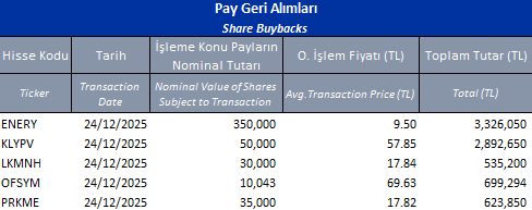 Pay geri alım programları kapsamında ilgili tarihte geri alım yapan şirketlerin listesini aşağıdaki tabloda bulabilirsiniz.