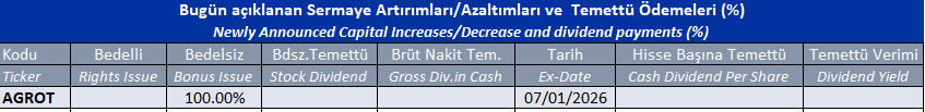 Gün içinde çıkmış veya bu sabah seans açılmadan önce açıklanmış sermaye artırımları ve temettü ödemeleri aşağıdaki tabloda görüntülenmektedir.