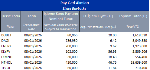 Pay geri alım programları kapsamında ilgili tarihte geri alım yapan şirketlerin listesini aşağıdaki tabloda bulabilirsiniz.