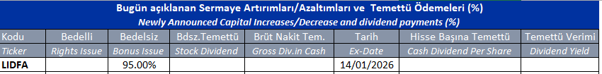 Sermaye Artırımları/Azaltımları ve Temettü Ödemeleri 13/01/2026