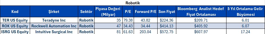 ABD’nin yeniden sanayileşmesi, rakibi Çin’in yeryüzündeki toplam robot sayısının yarısından fazlasını elinde bulundurması ve yapısal işgücü eksikliği gibi sebeplerden dolayı endüstriyel otomasyon konusunda hızlı adımlar atacaktır. Yapay zeka devrimiyle beraber biyoteknoloji ve robotik alanda görülmesi beklenen atılımlara artık çok az kaldı. ABD ise bu konuda hem Çin hem diğer Asya ülkelerine kıyasla bir hayli geride. Bu alandaki farkın hem start-uplar hem Tesla hem de aşağıdaki şirketler aracılığıyla kapatılmasını bekliyoruz.