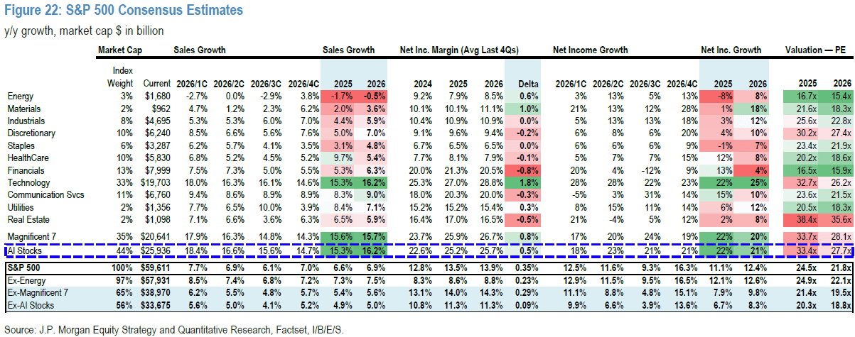 Muhteşem yedili teknoloji devleri, yapay zeka yatırımlarının merkezinde yer almaya devam ediyor ve genel beklentiler 2026’da %16-20’lik bir kazanç büyümesi yönünde. S&P 493 için Mag 7’ye yakınlaşmasını takip etmekle beraber gelir ve kar büyümeleri Mag 7 için hala endeksin geri kalanının oldukça önünde.