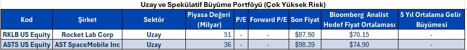 Yüksek volatilite içermekle beraber ASTS portföylerin spekülatif tarafına dahil edilebilecek bir hisse. Starlink evlere internet getirirken, AST SpaceMobile cebinizdeki telefona baz istasyonu hizmeti getirmeyi hedefler.