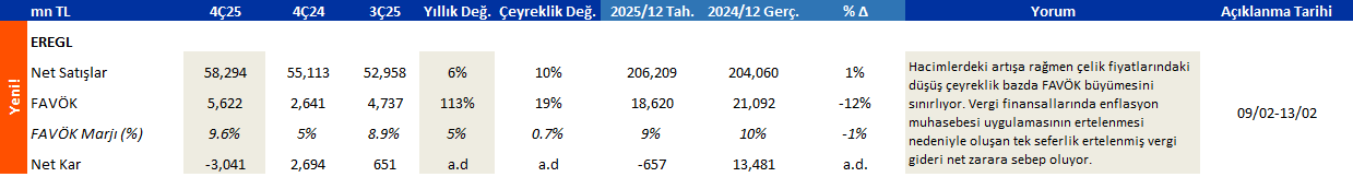 Hacimlerdeki artışa rağmen çelik fiyatlarındaki düşüş çeyreklik bazda FAVÖK büyümesini sınırlıyor. Vergi finansallarında enflasyon muhasebesi uygulamasının ertelenmesi nedeniyle oluşan tek seferlik ertelenmiş vergi gideri net zarara sebep oluyor.