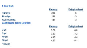 Tahvil piyasalarında risk iştahındaki toparlanmaya paralel olarak ABD getirilerinde geri çekilme öne çıktı. ABD 10 yıllık tahvil faizi 4 baz puan düşüşle %4,25’e inerken, 30 yıllık getiri 5 baz puan gerileyerek %4,87 oldu; 2 yıllık getiri ise %3,59 ile yatay seyretti. Avrupa’da Almanya 10 yıllık tahvil faizi 2 baz puan artışla %2,88’e yükselirken, İngiltere 10 yıllık getiri %4,46 seviyesinde değişmedi. ABD’de 20 yıllık tahvil ihalesine gelen güçlü talep de uzun vade faizlerdeki gevşemeyi destekleyen bir unsur olarak öne çıktı.