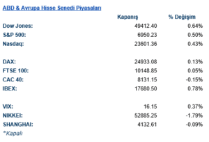 Avrupa hisse senedi piyasalarında ise ABD’ye kıyasla daha yatay ve temkinli bir görünüm hâkimdi. Almanya DAX endeksi %0,13, İngiltere FTSE 100 endeksi %0,05 ile sınırlı yükseliş kaydederken, Fransa CAC 40 endeksi %0,15 düşüşle günü tamamladı. İspanya IBEX endeksi %0,78 ile görece daha güçlü bir performans sergileyerek pozitif ayrıştı. Bölge genelinde yatırımcıların küresel para politikası görünümü ve ABD’de açıklanacak bilanço sonuçlarını beklediği, bu nedenle risk alma iştahının sınırlı kaldığı gözlendi.