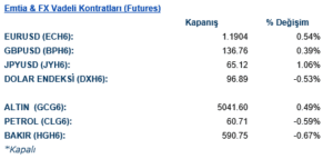 Değerli metaller cephesinde yükseliş eğilimi korundu. Altın vadeli kontratı (GCG6) %0,81 artışla 5.057,60 seviyesine yükselerek 5.000 dolar eşiğinin üzerinde kalıcılık sağladı. Doların zayıflaması ve artan politika belirsizlikleri, güvenli liman talebini destekleyen temel unsurlar olarak öne çıkıyor. Sanayi metallerinde ise daha zayıf bir görünüm izlendi; bakır (HGH6) %0,60 düşüşle 591,20 seviyesine gerilerken, küresel büyüme görünümüne ilişkin temkinli duruş fiyatlamalara yansıdı.