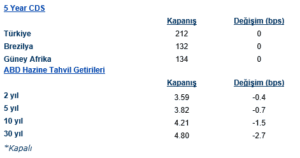 Gelişmekte olan ülke eurotahvillerinde ise genel olarak sakin bir seyir izlendi. Türkiye’nin 5 yıllık CDS primi 212 baz puan seviyesinde yatay kalırken, Brezilya ve Güney Afrika CDS’lerinde de anlamlı bir değişim gözlenmedi. Risk primlerindeki bu istikrar, küresel piyasalarda oynaklığın belirli varlık sınıflarında yoğunlaştığını, kredi riskinin ise şimdilik ikincil planda kaldığını gösteriyor. Türkiye tarafında yeni bu hafta da devam ediyor. Bugün İş Bankası ve Şekerbank iki yeni ihraç gerçekleştirdi. İş Bankası 11 yıl vadeli sermaye benzeri ihraç gerçekleştirdi. İhracın 2032 yılında call opsiyonu bulunuyor. $500 milyon büyüklüğündeki ihraç %7.575 getiri seviyesinden ihraç olurken ihraca $1.4 milyarın üstünde talep geldi. Şekerbank 2031 yılında call opsiyonu bulunan ek sermaye benzeri kıymet ihracında bulundu. Yeni ihraç %9.45 getiri seviyesinden ihraç olurken ihraç büyüklüğü $150 milyon oldu.