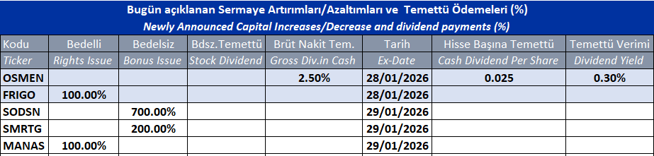 Sermaye Artırımları/Azaltımları ve Temettü Ödemeleri 28/01/2026