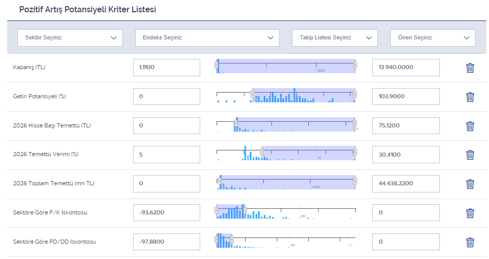 Burada yer alan fiyatlar, veriler ve bilgilerin tam ve doğru olduğu garanti edilemez. Hesaplamalarda doğru olduğu düşünülen, genel kabul görmüş formüller tüm şirketler için kullanılmıştır. Şirket özelinde tek seferlik gelir/gider kalemleri ihtiva eden, farklı hesaplama yapılması gereken şirketlerde farklılıklar görülebilir. Hesaplamalar farklı kaynaklar ile karşılaştırıldığında değişik sonuçlar görülebilir. Veriler İş Yatırım Menkul Değerler A.Ş. tarafından güvenilir olduğuna inanılan kaynaklardan alınmıştır. Hesaplamalarda kullanılan verilerin ve hesaplanan değişkenlerin doğruluğu garanti edilemez. Yapılacak filtremeler sonucu ulaşılacak sonuçlar herhangi bir yatırım aracının alım-satım önerisi ya da getiri vaadi olarak yorumlanmamalıdır. Bu sonuçlara dayanarak yatırım kararı verilmesi beklentilerinize uygun sonuçlar doğurmayabilir. Hesaplamalarda veya teknoloji farklılıkları nedeni ile ortaya çıkabilecek hatalardan İş Yatırım Menkul Değerler A.Ş. sorumlu değildir.