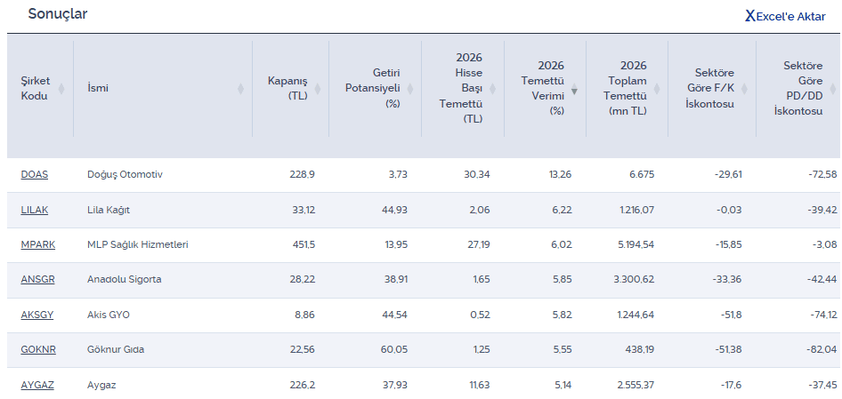 2026’da %5 üzeri temettü verimi beklenen, sektörüne göre iskontolu şirketler listesini aşağıda inceleyebilirsiniz.