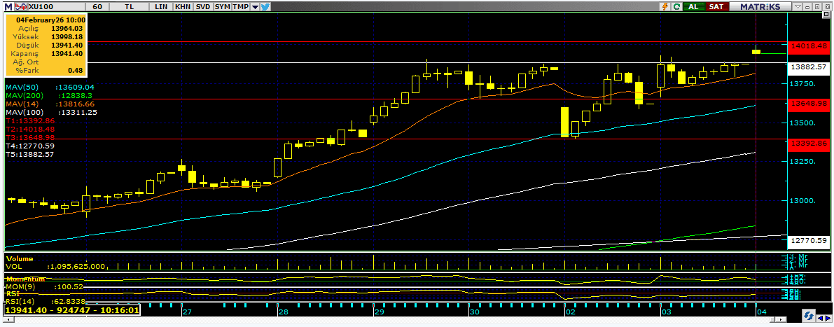 Endeks için 13.900 ve 14.000 seviyelerinin arasındaki bölge kısa ve orta vade için direnç bölgesi olarak değerlendirilebilir. Destek olarak 13.800 ve 13.600 seviyeleri öne çıkıyor.