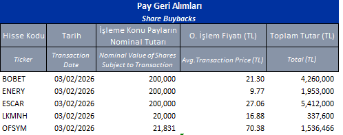 Pay geri alım programları kapsamında ilgili tarihte geri alım yapan şirketlerin listesini aşağıdaki tabloda bulabilirsiniz.