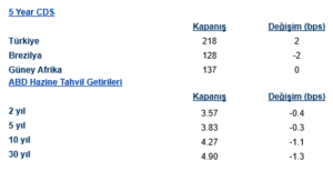 CDS tarafında Türkiye’nin 5 yıllık CDS primi 218 baz puan seviyesinde yatay kalırken, Brezilya CDS’i 128 seviyesinde 2 baz puan düşüş kaydetti. Güney Afrika CDS’i ise 137 seviyesinde yatay işlem gördü.