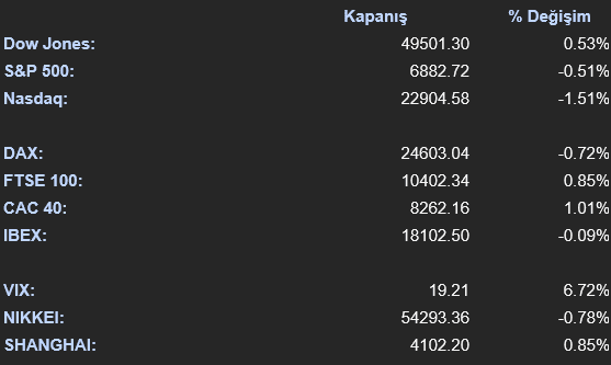 Jeopolitik cephede ABD–İran nükleer görüşmelerine ilişkin çelişkili haber akışı risk algısını dalgalandırdı. Petrol piyasaları alıcılı seyrederken, kripto piyasalarındaki düşüş eğilimi devam ederek riskli varlıklardaki satış baskısını yansıttı. Şirket haberleri tarafında Nvidia’nın OpenAI’a 20 milyar dolarlık yatırım görüşmeleri dikkat çekerken, Amazon güncellenmiş Alexa’yı ABD’de piyasaya sürerek yapay zekâ rekabetini hızlandırdı. Texas Instruments, Silicon Laboratories’i 7,5 milyar dolara satın almak üzere anlaşmaya varırken, SpaceX’in ABD dışındaki bankalarla IPO görüşmeleri yaptığı belirtildi. New York Times maliyet artışları nedeniyle düşüş yaşarken, Washington Post geniş çaplı işten çıkarmalara başladı. Sağlık tarafında Eli Lilly güçlü talep beklentisiyle olumlu satış tahmini açıklarken, Novo Nordisk zayıf öngörü sonrası sert değer kaybıyla ayrıştı.