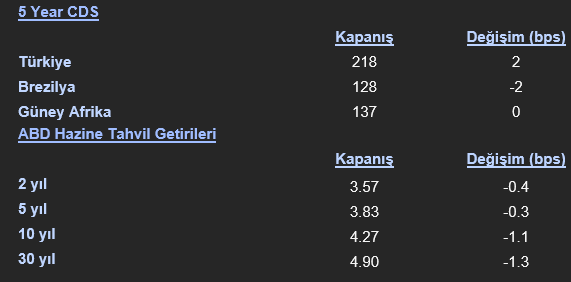 ABD tahvil piyasasında gün genelinde sınırlı satıcılı bir görünüm izlendi. Getiri eğrisi boyunca yukarı yönlü hareketler dikkat çekerken, özellikle uzun vadelerde faizlerde sınırlı artış öne çıktı. ABD 2 yıllık tahvil getirisi 1,4 baz puan düşüşle %3,555 seviyesine gerilerken, 3 yıllık getiri 1,1 baz puan düşüşle %3,632 seviyesinde oluştu. 5 yıllık tahvil getirisi 0,2 baz puan düşüşle %3,830 seviyesine inerken, 7 yıllık getiri 0,3 baz puan artışla %4,047 seviyesine yükseldi. ABD 10 yıllık tahvil getirisi ise 0,8 baz puan artışla %4,274 seviyesine çıkarak uzun vadeli faizlerde sınırlı yukarı yönlü seyre işaret etti. Avrupa tahvil piyasalarında ise genel olarak alıcılı bir görünüm öne çıktı. İngiltere 10 yıllık tahvil getirisi 2,9 baz puan artışla %4,545 seviyesine yükselirken, Fransa 10 yıllık tahvil getirisi 1,9 baz puan düşüşle %3,445 seviyesine geriledi. Almanya 10 yıllık tahvil getirisi 3,1 baz puan düşüşle %2,857 seviyesine inerken, İtalya 10 yıllık tahvil getirisi 2,9 baz puan gerileyerek %3,467 seviyesinde oluştu. İspanya 10 yıllık tahvil getirisi de 2,6 baz puan düşüşle %3,228 seviyesinde takip edildi. Türkiye 10 yıllık USD tahvil getirisi 1,3 baz puan düşüşle %6,777 seviyesine geriledi. Türkiye’nin 5 yıllık CDS risk primi ise gün sonunda 219,092 seviyesinde takip edildi.