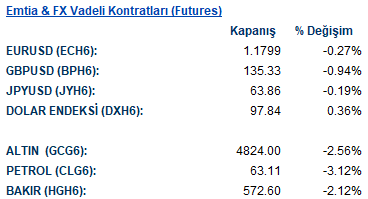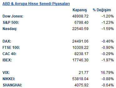 Gelişen piyasalarda doların güçlenmesi ve emtia fiyatlarındaki gerileme baskı yarattı. MSCI gelişen ülke para birimleri endeksi %0,3, hisse senetleri %1,5 düşerken, Güney Afrika randı ve Kolombiya pesosu en zayıf performans gösterenler arasında yer aldı. Genel olarak artan volatilite, küresel piyasalarda temkinli duruşun güçlendiğine işaret ediyor. Emtia tarafında da riskten kaçışın etkileri hissedildi. Gümüş fiyatları %16 ile sert bir düşüş kaydederken, petrol fiyatları ABD–İran görüşmelerine ilişkin haber akışının etkisiyle geriledi.