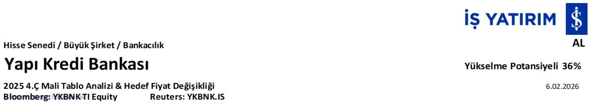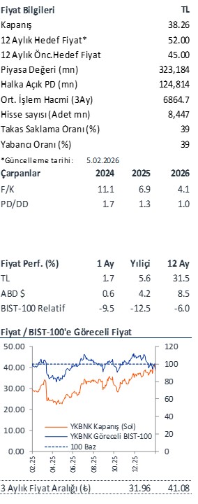 Tahmin ufkumuzu bir yıl ileri taşıyarak, hedef fiyatımızı hisse başına TL 52’ye (önceki: TL 45) yükseltiyoruz. 4Ç25 sonuçlarının beklentilere büyük ölçüde paralel olması nedeniyle, piyasa tepkisinin sınırlı kalmasını bekliyoruz. 2025 bütçe varsayımları tahminlerimizle uyumlu olsa da, aktif kalitesindeki görece güçlü duruşu nedeniyle YKB’yi beğenmeye devam ediyoruz. YKBNK için AL tavsiyemizi koruyoruz.