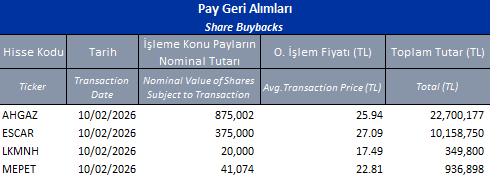 Sermaye Artırımları/Azaltımları ve Temettü Ödemeleri 10/02/2026