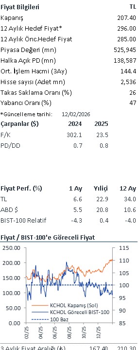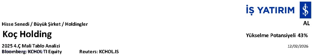 Gerçekleşen ve Tahminler: Koç Holding, UMS-29 kapsamında 4Ç24’te kaydedilen 8 milyar TL’lik net zarara kıyasla 4Ç25’te 7 milyar TL net kar elde etti (piyasa: 4,4 milyar TL). Son çeyrekte ana segmentlerin net kar katkısında 4Ç24’e kıyasla yıllık bazda iyileşme gözlendi. Enerji ve Dayanıklı Tüketim segmentlerindeki zayıflığa rağmen Otomotiv segmentinin güçlü katkısı yıllık bazda kombine ciro büyümesini destekledi. Grup,  konsolide bazda, 4Ç25’te 4,6 TL parasal kazanç kaydederken, parasal kayıplar 4Ç24’te 1,1 milyar seviyesindeydi. Finans segmentinde 4Ç24’te 6 milyar TL’yi aşan seviyede parasal zarar kaydedilirken, bu çeyrekte segmentin parasal zararı 3 milyar TL’nin altına geriledi.  İştirakler sonuçlarını açıklamış olsa da enflasyon muhasebesinin karlılık üzerindeki olumsuz etkisindeki düşüşün devamına işaret eden ve piyasa beklentisini aşan net kar rakamına hafif olumlu bir tepki görebiliriz