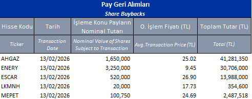 Pay geri alım programları kapsamında ilgili tarihte geri alım yapan şirketlerin listesini aşağıdaki tabloda bulabilirsiniz.
