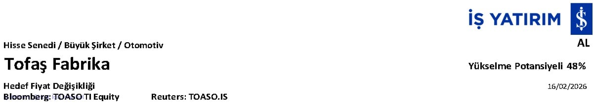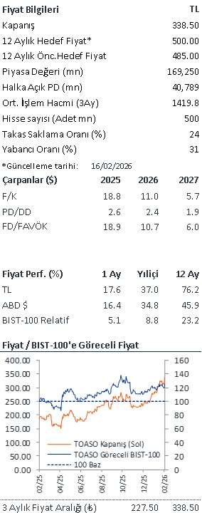 TOASO için İNA bazlı hisse başına hedef fiyatımızı, İNA değerlememizin 3 ay ileriye taşınması, makro varsayımlarımızda yapılan revizyon, şirketin 2026 yılına ilişkin beklentilerinin yansıtılması ve açıklanan 2025 mali sonuçlarına göre tahminlerimizin güncellenmesi nedeniyle önceki 485 TL’den 500 TL’ye yükseltiyoruz. Hedef fiyatımızın cazip bir yükseliş potansiyeli sunması nedeniyle TOASO hisseleri için AL tavsiyemizi yineliyoruz. Tofaş Fabrika’nın, Stellantis’in Türkiye operasyonlarının satın alınmasının ardından iç pazardaki güçlü konumu, satın almanın yaratacağı potansiyel gelir ve maliyet sinerjilerinin olumlu etkisi, yeni model yatırımlarıyla üretim ve satış hacmi artışı sayesinde KKO’da beklenen iyileşme ve artan ölçek ekonomisi nedeniyle karlılıktaki iyileşme ile bir dönüm noktasında olduğuna inanıyoruz. Mevcut Agea binek otomobil modelinin (üretim ömrü altı aylık bir uzatmanın ardından 1Y26’da sona eriyor) yerine geçecek potansiyel yeni bir binek otomobil modeli yatırımına ilişkin haberlerin, hissenin performansı için bir katalizör olacağına inanıyoruz.