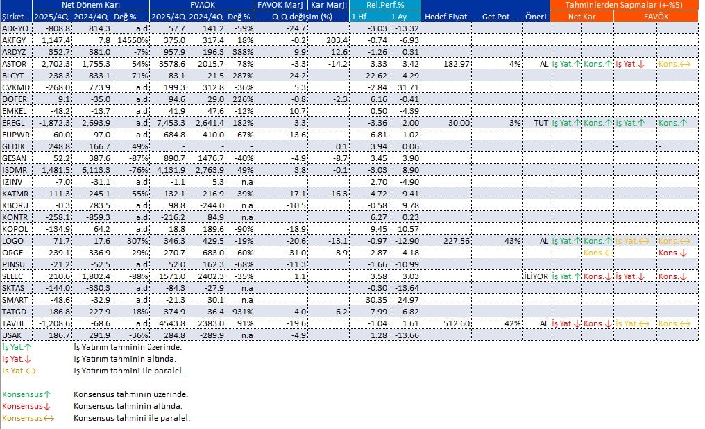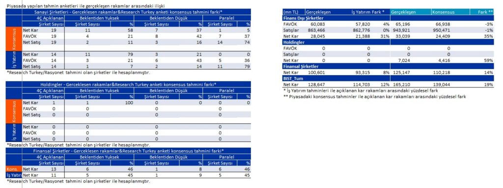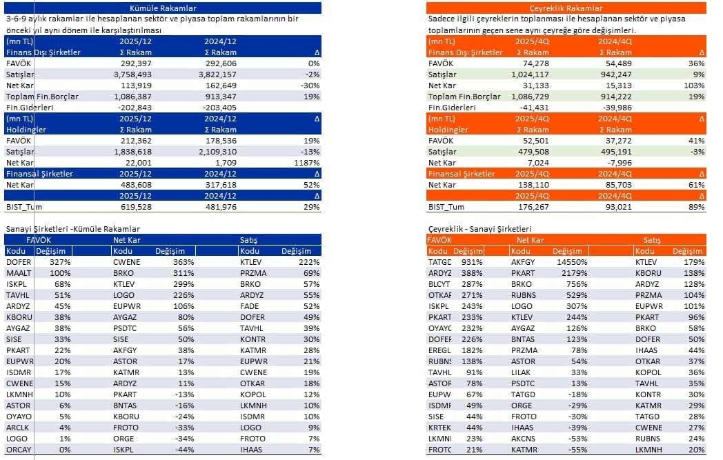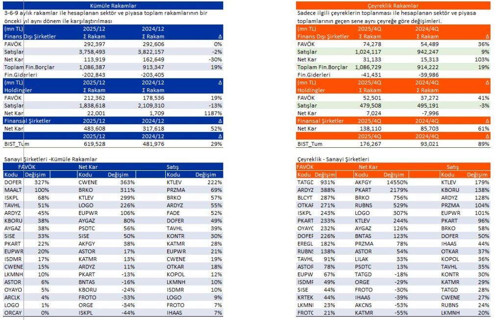 Raporun içinde ise, şu ana kadar finansallarını açıklayan BIST şirketlerini, kümüle edilerek toplanmış toplu piyasa ve sektör karlılıklarını ve piyasa tahminleri ile açıklanan finansal sonuçların karşılaştırmalı analizini bulabilirsiniz.