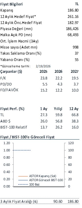 Globalde güçlü talep devam ediyor. Küresel güç transformatörü pazarında şebeke yatırımlarının tetiklediği arz kısıtları ve güçlü talep döngüsü, Astor Enerji için güçlü bir yatırım tezi sunmaya devam ediyor. Pazardaki arz kısıtlarının 3-4 yıl daha devam edeceğini öngörüyoruz. Şirketin bu sıkı talep ortamını fırsata çeviren ihracat odaklı stratejisi (2026 hedefi: %52 ihracat payı) ve 2026 cirosunun %72’sini şimdiden garanti altına alan 794 milyon dolarlık bakiye siparişi de bu büyümeyi öngörülebilir kılıyor.