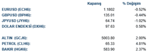 Fed tutanaklarının şahin tonu sonrası ABD tahvilleri baskı altında kaldı. Bazı politika yapıcıların enflasyon konusunda endişeli olması ve gerekirse faiz artırımı sinyali vermesi, özellikle kısa vadeli tahvillerde satışa yol açtı. ABD Hazine’sinin gerçekleştirdiği 20 yıllık tahvil ihalesi zayıf talep gördü. 16 milyar dolarlık ihale %4,664 getiriyle sonuçlandı.. Bu zayıf talep sonrası 30 yıllık faiz günün zirvesine çıktı. Getirilerde 2 yıllık ABD hazine tahvil getirisi 3.1 baz puan artarak 3.46, 5 yıllık tahvil faizi 2.8 baz puan artarak 3.64 ve 10 yıllık tahvil faizi 2.6 baz puan artarak 4.08 seviyelerine geldi.