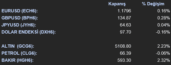 Döviz piyasalarında dolar endeksi (DXH6) %0,16 düşüşle 97,70 seviyesine gerilerken, majör para birimlerinde dolar karşısında yukarı yönlü bir seyir izlendi. EUR/USD paritesi (ECH6) %0,16 artışla 1,1795 seviyesinde fiyatlanırken, GBP/USD (BPH6) %0,28 yükselişle 134,87 seviyesine çıktı. JPY/USD (JYH6) ise %0,03 ile sınırlı pozitif bir görünüm sergileyerek 64,62 seviyesinde işlem gördü. Dolar endeksindeki zayıflama, ABD tahvil faizlerindeki yükselişe rağmen küresel risk iştahının dengeli kalmasıyla birlikte değerlendirildi. Değerli metaller tarafında güçlü alımlar dikkat çekti. Spot altın %1,79 yükselişle 5.085,32 dolar seviyesine çıkarken, spot gümüş %6,92 artışla 83,94 dolar seviyesinde işlem gördü. Vadeli tarafta ise altın kontratı (GCG6) %2,23 primle 5.108,90 seviyesine yükseldi. Değerli metallerdeki bu yükseliş, enflasyon verilerinin ardından reel faiz beklentilerindeki dalgalanma ve portföylerde güvenli liman talebinin korunmasıyla ilişkilendirildi. Enerji cephesinde karışık bir görünüm izlendi. WTI ham petrol (CLG6) %0,06 düşüşle 66,39 dolar seviyesine gerilerken, Brent petrol %0,04 kayıpla 71,63 dolar seviyesinde fiyatlandı. Buna karşılık Henry Hub doğal gaz %1,34 artışla 3,04 seviyesine yükselirken, Avrupa TTF doğal gaz kontratı %4,46 geriledi. Enerji piyasasında fiyatlamalar arz-talep dengesi ve küresel büyüme beklentilerine ilişkin karışık sinyallerle şekillendi. Endüstriyel metallerde ise genel olarak pozitif bir seyir öne çıktı. LME alüminyum %1,14 artışla 3.102,50 dolar seviyesine yükselirken, LME bakır %1,21 primle 12.964 dolar seviyesinde işlem gördü. Vadeli bakır kontratı (HGH6) %2,32 artışla 593,30 seviyesine çıktı. Nikel %0,36 yükselirken, demir cevheri %1,31 düşüş kaydetti. Spot piyasada gümüşte görülen güçlü yükseliş ve baz metallerdeki toparlanma, küresel talep beklentilerinin kısmen güçlendiğine işaret etti.
