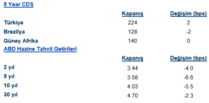 Gelişmekte olan ülkeler cephesinde tablo karışıktı. Türkiye’nin 5 yıllık CDS primi 224 baz puana yükselerek hafif artış gösterirken, Brezilya’da risk primi geriledi, Güney Afrika’da ise değişim olmadı. Türkiye tarafındaki CDS hareketi şimdilik sınırlı kalmakla birlikte, küresel risk iştahındaki zayıflamanın yakından izlendiğini gösteriyor.
