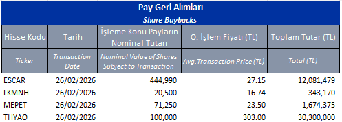 Pay geri alım programları kapsamında ilgili tarihte geri alım yapan şirketlerin listesini aşağıdaki tabloda bulabilirsiniz.