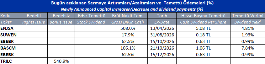 Gün içinde çıkmış veya bu sabah seans açılmadan önce açıklanmış sermaye artırımları ve temettü ödemeleri aşağıdaki tabloda görüntülenmektedir.