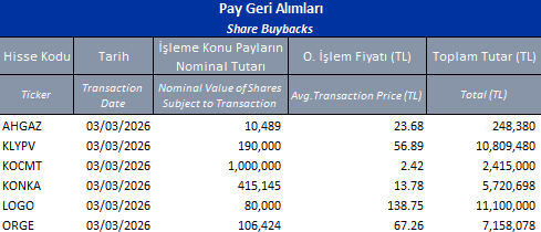 Pay geri alım programları kapsamında ilgili tarihte geri alım yapan şirketlerin listesini aşağıdaki tabloda bulabilirsiniz.